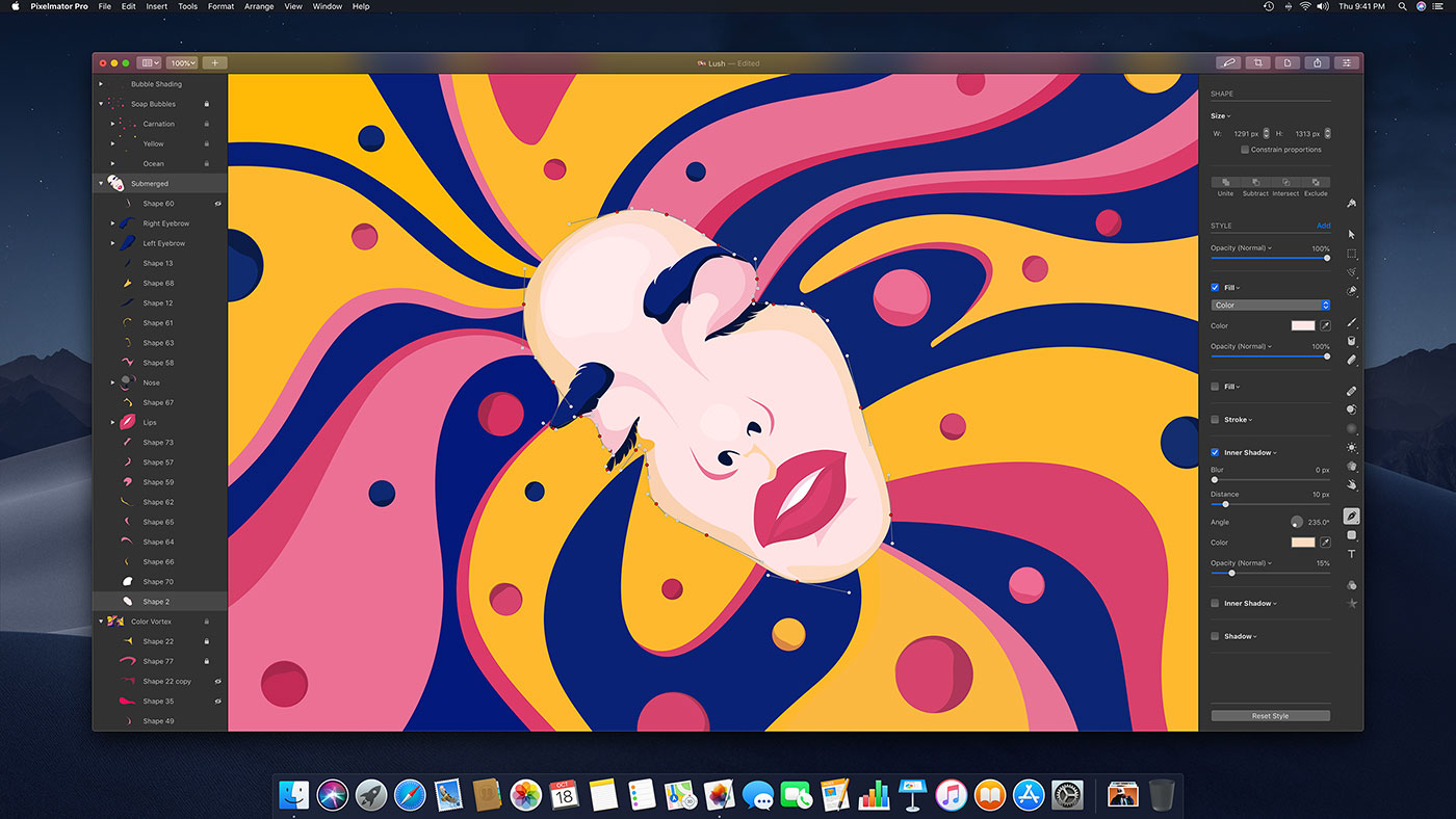 The Pixelmator Team has also packed a wide range of other features and innovations into Pixelmator Pro, such as HEIF file format compatibility; full RAW support, including support for multiple RAW layers; superior support for Adobe Photoshop images; complete macOS integration via full support for iCloud, Versions, Tabs, Full Screen, Split View, Sharing, Permanent Undo, Touch Bar, Wide Color, and others; Metal 2-powered painting tools and dual texture brushes; powerful retouching, reshaping, selecting, type, shape and vector tools; and a lot more.